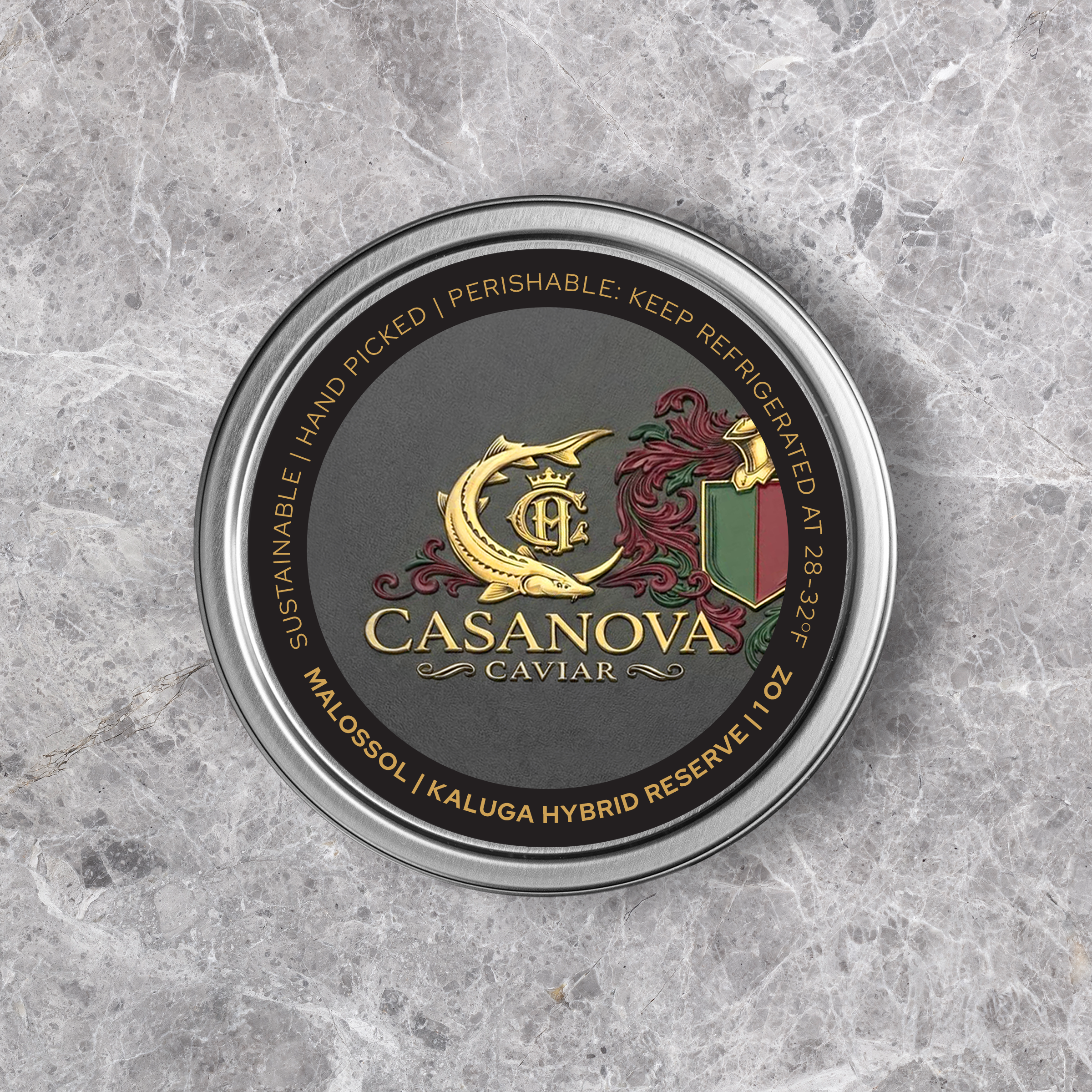 Black metallic tin of casanova caviar featuring a gold and red crest design on the lid for luxury gourmet use